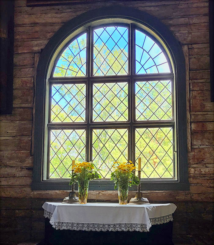 I am sharing an image from inside the little wooden church, of the window behind the altar. Fresh wildflowers sit on a lace-trimmed linen altar cloth. This simple blessing captured the spirit of the day, learning about the Finnish lifestyle and history.
