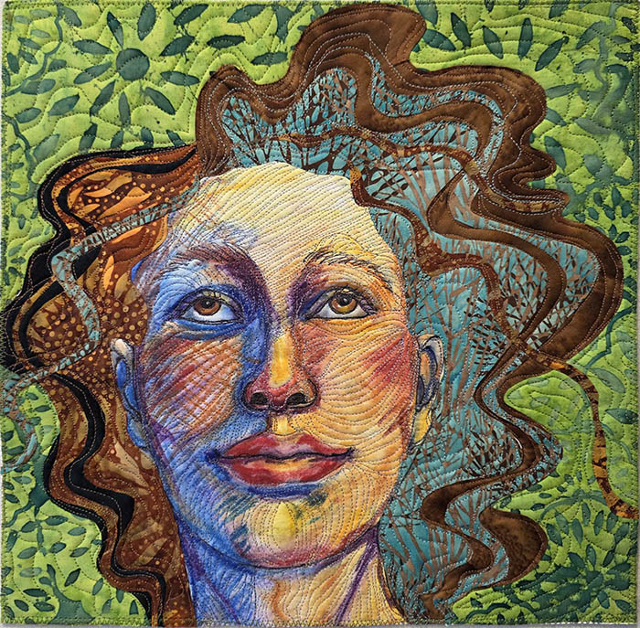 Finally I used various colors of Aurifil 50 wt cotton thread, to freemotion stitch on my Bernina Q20 which is a sit-down midarm with a 20″ throat. (I love that machine!) Because this piece is small, I gave it a matching green zigzag edge. It can be hung as is, or matted and framed.