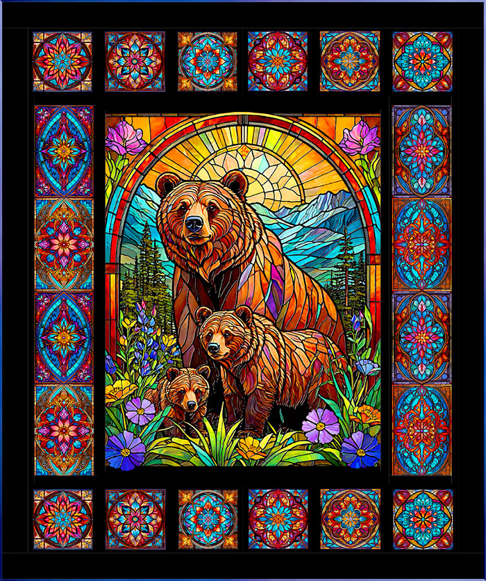 Tonight’s Free eQuilter Pattern features a wondrous Stained Glass Mother Bear and Cubs panel, along with our exclusive Illuminated Mandalas panel and stripe.