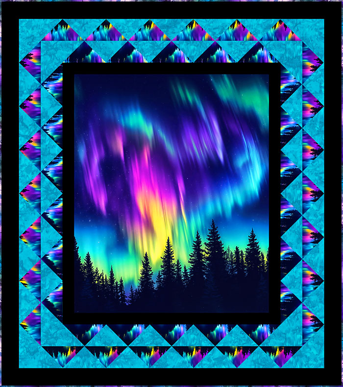 Plus we offer a Free exclusive 59″ x 67″ quilt design! Start with our exclusive Rubin Studios selvedge to selvedge single border print. Then piece the borders with our coordinating allover Aurora Trees fabric and Hoffman Hand Dye. Our rich Pine Forest 108″ wide fabric is the perfect backing for this captivating northern lights quilt.