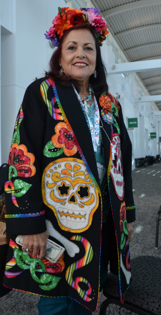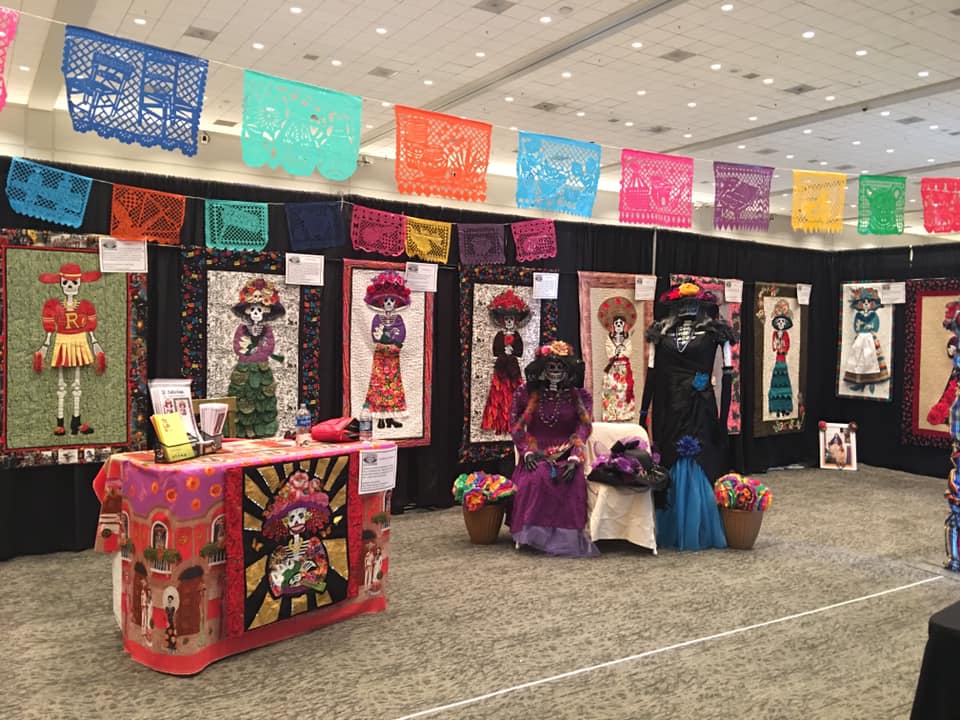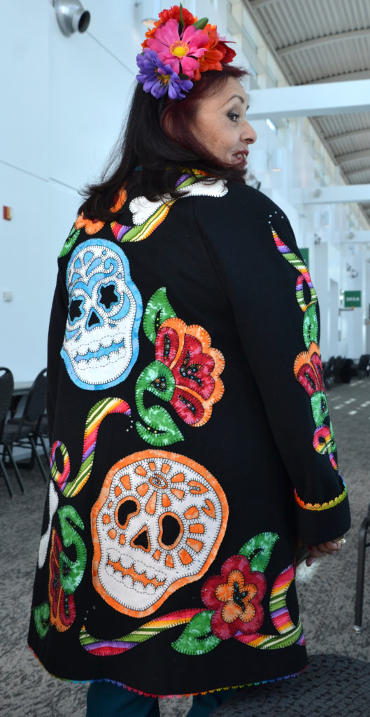 Over coffee later that day, we discovered that we have many mutual friends associated with the quilt festival in Mexico. Jane’s work reminds me of Frida Kahlo’s style, with Guadalupe and Day of the Dead motifs. Her bright Latino colors will be familiar if you’ve seen the movie “Coco”. When I look at her work, I can hear the Mariachis playing….