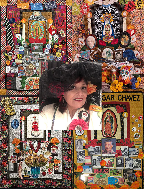 Come and enjoy a celebration of life, by building a memory quilt to honor loved ones. Can be a family member, a person we admire, a whole family or a beloved pet. We will have a short power point detailing the traditions of altar building, and the symbolic motifs you can use to embellish and build your altar quilt. We will be using piecing and fusible appliqué to build our altar, then adding personal motifs and photos to honor our loved ones. Quilt will be approximately 47” x 58” finished.