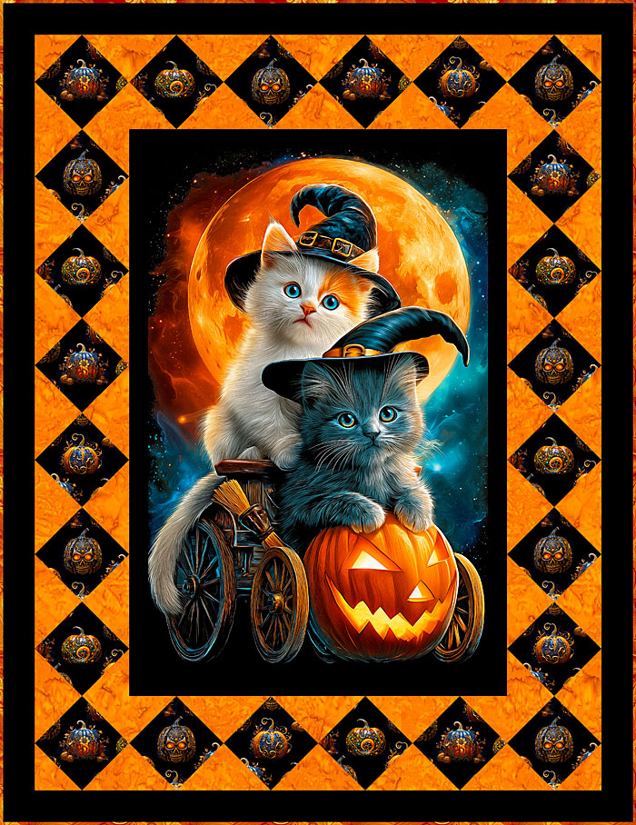 Tonight’s Free Quilt Pattern features our adorable Magic Kitten Pumpkin Ride fabric. An adorable pair of cute kittens are dressed in witches outfits, riding a pumpkin wagon, and a bright orange Halloween moon glows in the background.