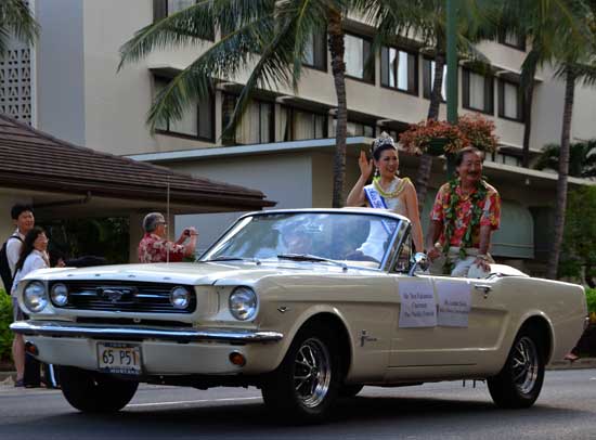 The photo below is from the Pan-Asian festival parade last week, which took 3 hours to snake down the main drag in Waikiki, and had lots of hometown Hawaiian parade moments like ladies strolling in ornate kimonos, young men demonstrating judo on the street, hula girls and Tahitian dancers, and in this image we have Miss Hawaii International with her own lovely tiara, waving from the back seat of a vintage Mustang convertible.