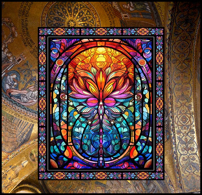 This week we got in this gorgeous stained glass panel by Dan Morris, so I have set it against a backdrop of the basilica’s gold mosaic domed ceiling. You can see more of my photos from my research trips in Italy on this photo page. Photos with costumes at Carnival time are on this page.