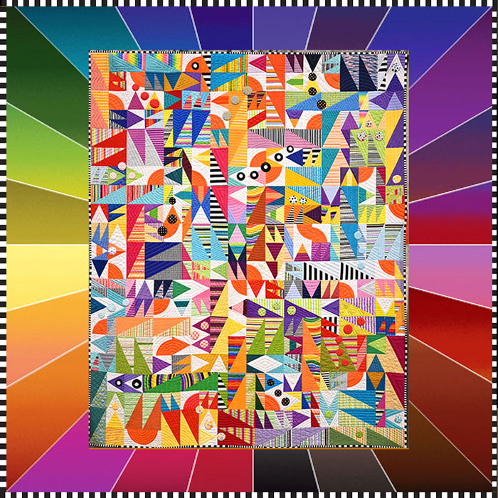 Part of what makes this busy quilt so fun and eye-catching is the juxtaposition of Solid Brights with Black-and-White stripes. For those of you who have attended my trend lectures, you know this Black-and-White-and-Color trend is ongoing and mutating. As a result, we have been expanding our selection of Black and White stripes because they are so fun to work with – give it a try!