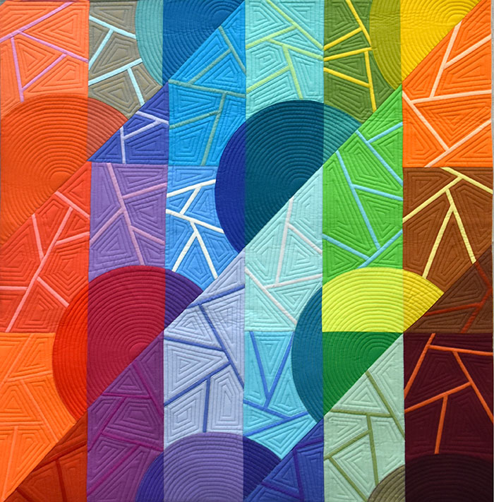 Having just returned from QuiltCon in Austin TX, I wanted to tell you about the show and give you a taste of the quilts we saw. Here is a detail shot of Terry S. Peart’s quilt “Seasons”. She wrote “In Nature, the color of light changes from morning to night, and it changes from season to season. The colors of each new season inspire us and affect our moods. Our lives are not unlike the seasons…”