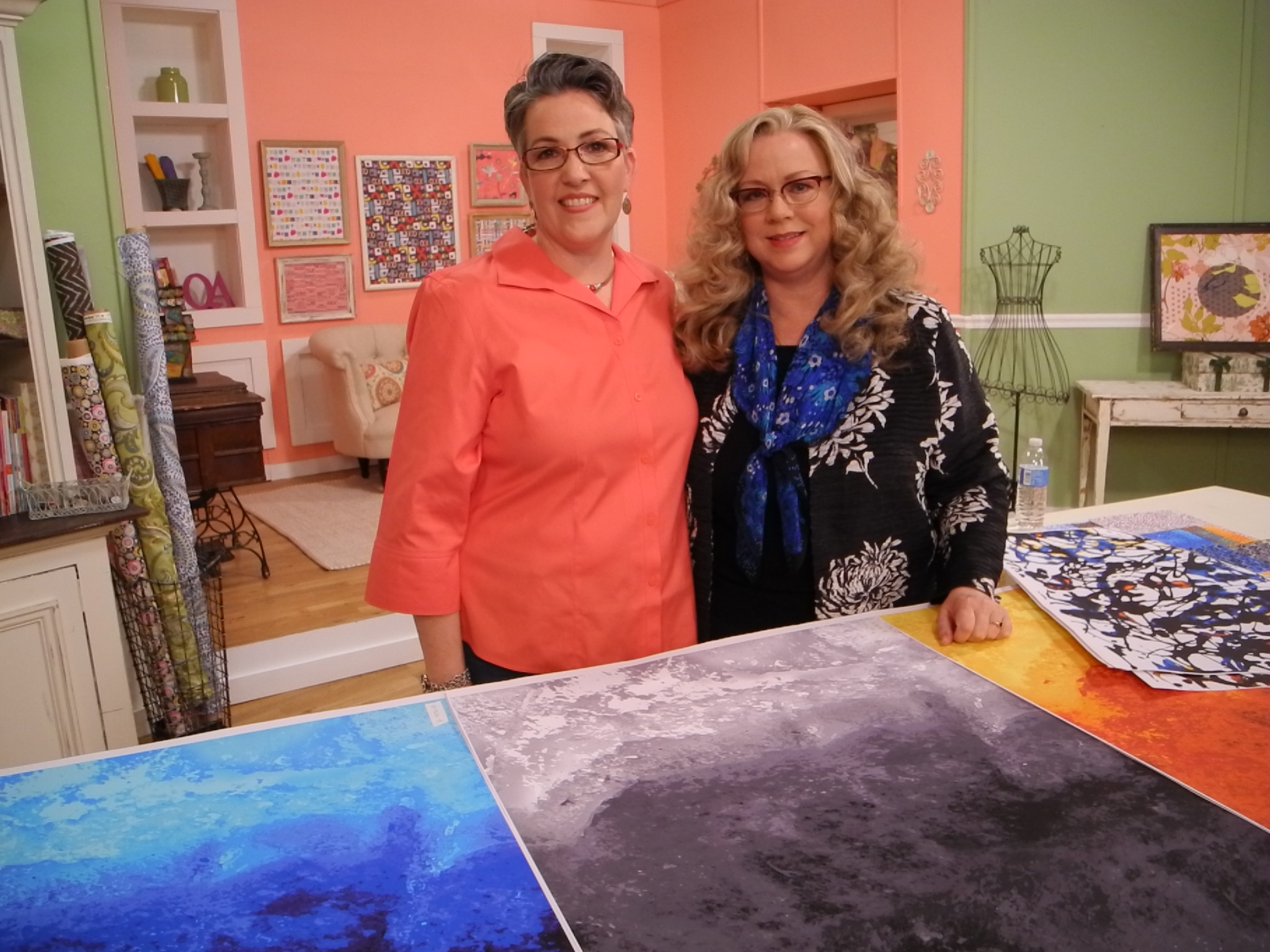 In my QA TV segment, I show the fundraiser fabric collection "Urban Textures" for SAQA (Studio Art Quilt Association). Susan Brubaker-Knapp was enthusiastic on her first day of the shoot in her new role as Quilting Arts TV host. I felt it was such an honor to work with her on that first day!