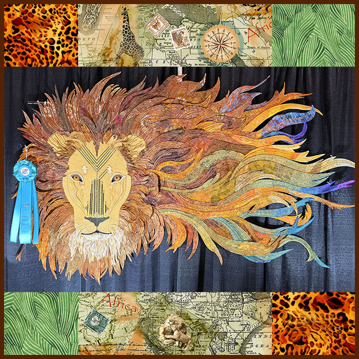Techniques & Materials: Couching of yarn and perle cotton throughout. Decorative stitching and free motion quilting. Hand beading, hand embroidery (eyes). Hand applique. Donated fabrics, some new African fabrics. Heavy stabilizer for some mane pieces. (Pellon Fuse-N-Shape.) Scrap batting.