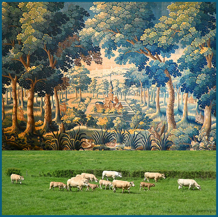 This castle was considered so beautiful and magical that it was the inspiration Charles Perrault took for his tale of Sleeping Beauty. (“La Belle au Bois Dormant”) The image above combines 2 photos from this chateau. The top is a landscape tapestry hanging inside (I was told it was original to the castle) and also below the lovely herd of cream-colored cows that walked out into a green meadow as I left the grounds. Between the tapestry and the pastoral scene, I could imagine how it might have looked in the 17th century. The castle was filled with 16th and 17th century tapestries from Brussels. In fact I saw many of these historic Belgian tapestries on this part of my trip, which were pointed out by the proud group of Belgians in my tour group.