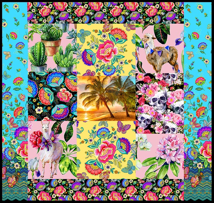 The last couple weeks we’ve been featuring snowy holiday themes, so now for something completely different, I’m thinking you are about ready for a little dream vacation south of the border. I wanted to make sure you saw this floral collection Dazzling Garden, which reminds me of the beautiful hand-embroidery I’ve seen in Mexico, Guatemala and Brazil. It also happens to match up pretty spectacularly with the Frida Kahlo fabrics. So I’ve put together a colorful collage with some of these fun fabrics, to add a little Cha-Cha to your Wednesday.