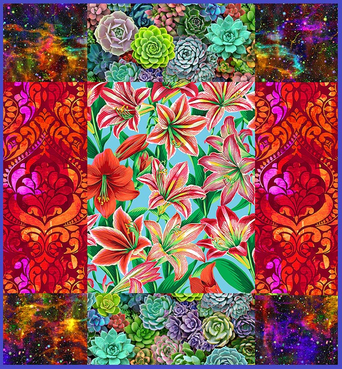 Some of my favorite fabrics are brilliant combinations of ordered symmetry and wild chaos. A field of flowers. A starry sky. Splashy abstract prints that have been cut up and tamed into a large scale traditional quilt, thereby making it something new and different. The Inner Child loves to teeter back and forth between structure and creative pandemonium. Make a plan, then take off on an unplanned tangent. Organize colors, and then throw them on the table to audition unexpected combinations.
