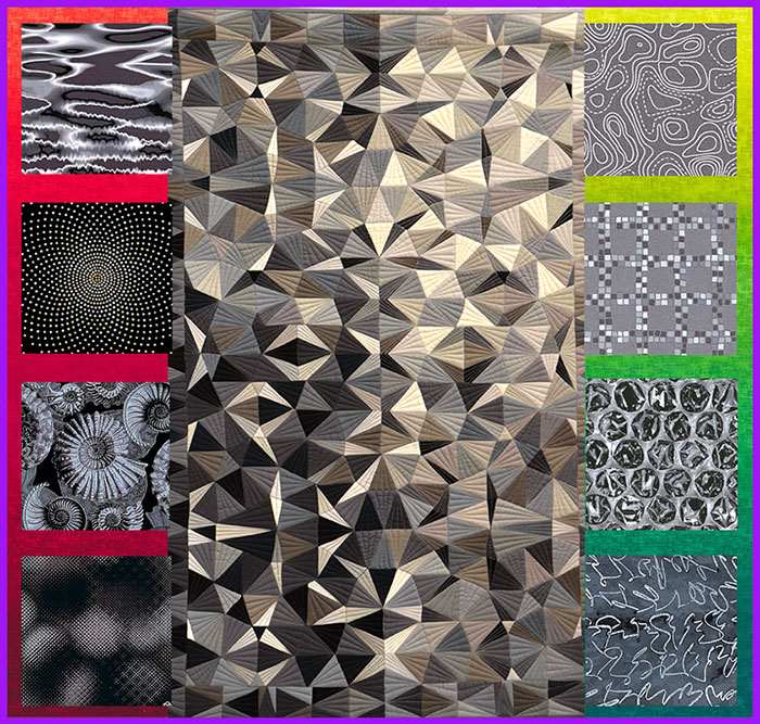 In the center of this collage, I am featuring Katherine Jones’ quilt “Facets”, made with a 45 degree triangle and her collection of solid gray fabrics. Katherine is from Tasmania, Australia…and is in the Tasmanian Modern Quilt Guild!