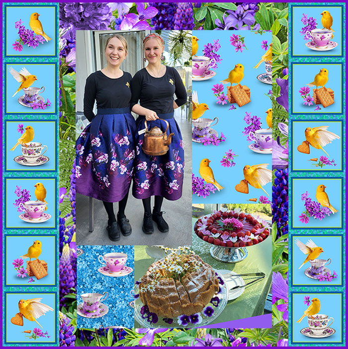 The 2 charming young ladies and the photo of fancy floral teacakes, are from a 19th century country manor house I visited in Finland, on my opera tour. Our long bus trip back to Helsinki, after spending a week by the lake and in the forest, was softened by our tea party at this delightful country estate. It was clearly a labor of love by the owners and staff. You can see photos of this estate, and other delights from Finland, on my photo pages. (I have now uploaded 225 photos which I hope will bring you some joy and creative inspiration.)