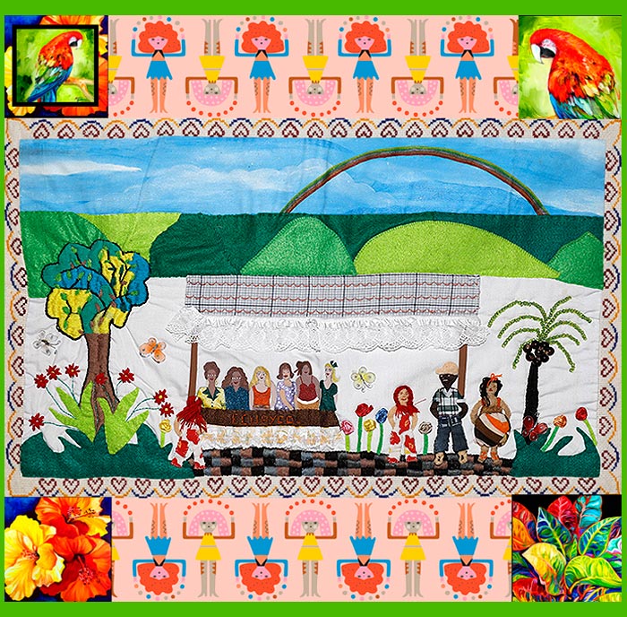 Some of the narratives that are stitched into the Common Threads story cloth pieces are difficult to look at. They look like folk art at first glance, but the stories that are shared are profound and emotional. This story cloth above however, tells the story of community support of the healing process.