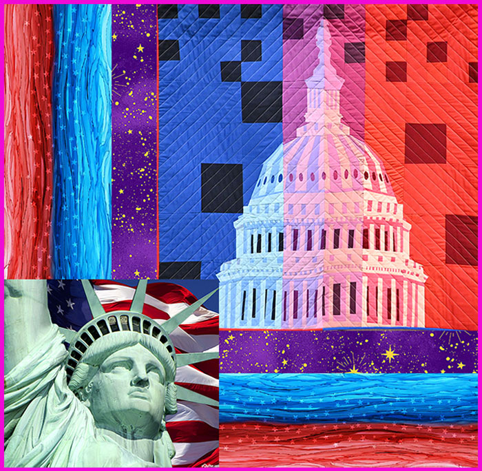* The collage image above is made with eQuilter fabrics, and Aynex Mercado’s quilt “American Gradation”, photographed by Luana Rubin at QuiltCon 2024.