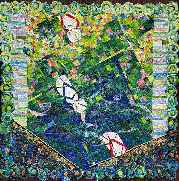 This quilt by Taiwanese quilter Tsui Hua Chen is about “Taking a Stroll”. Notice that instead of a binding to finish the edge, the border is made up of a continuous strip of scrappy log cabin roses linked together.