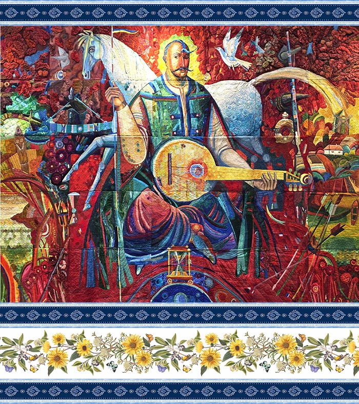 The figure of Cossack Mamay is embedded in Ukrainian folklore, portrayed in many works of art and music. This legendary figure represents a force that overcomes and defeats enemies against all odds. He represents a defending warrior, upon whom the future of independent Ukraine rests. It is an archetypal image of a man who strives to lead a peaceful life in the countryside, accompanied by his sweetheart and his faithful horse.
