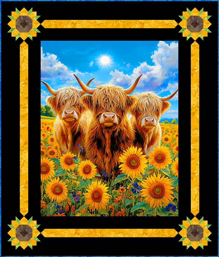 Plus we offer a Free exclusive 53″ x 62″ quilt design! Start with our 35″ x 44″ Weld Highland Cows panel, then piece the Sunflower Stars in each corner with Hoffman Hand-Dyes, and set against solid black background.
