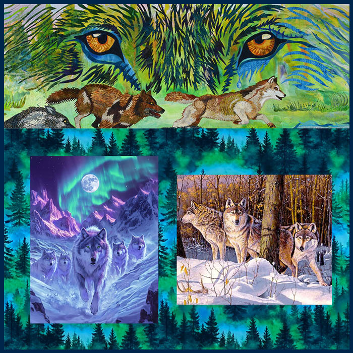 I have included a beautiful new Forest quilt backing, and 2 exclusive Wolf-themed panels, in the fabric collage above. We hope you like them!