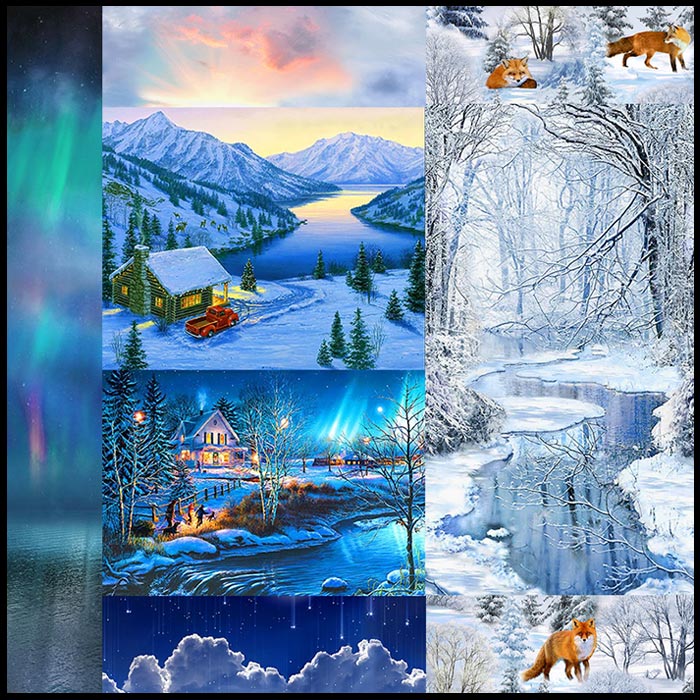 So here is a Winter Fantasy Landscape for you to enjoy. These are all Winter, Christmas or Northwoods fabrics we have in stock right now. Remember that these seasonal fabrics are usually hard for us to restock (what they call “One-and-Done” in the industry) so if something here is calling your name, I suggest you snap it up.