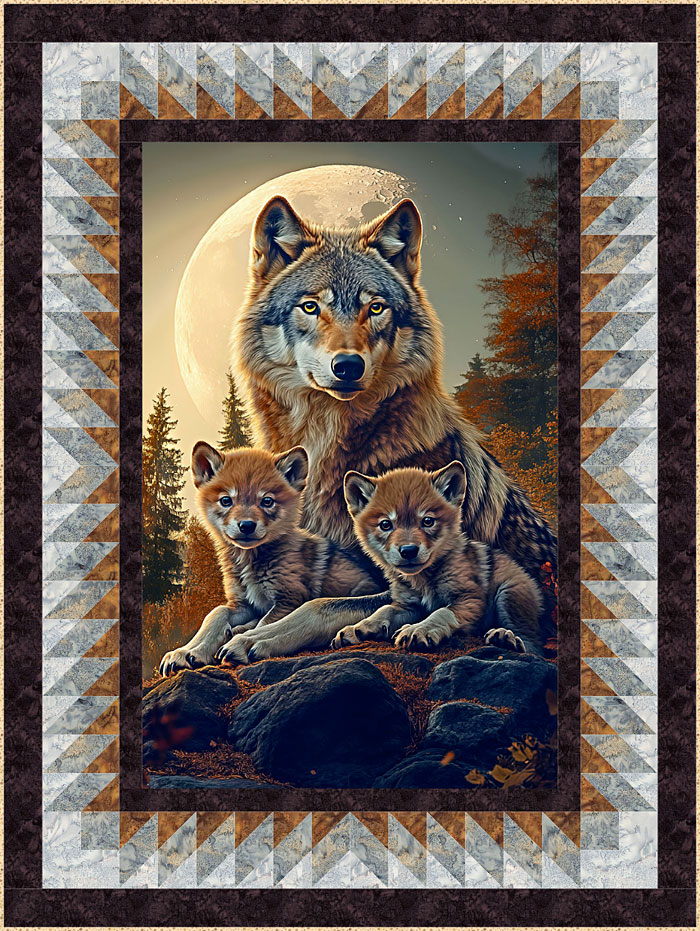 Tonight’s Free Quilt Pattern features a mother wolf and her two pups sitting majestically beneath the full moon in a midnight forest. Wolves symbolize loyalty, teamwork, protection and playfulness.