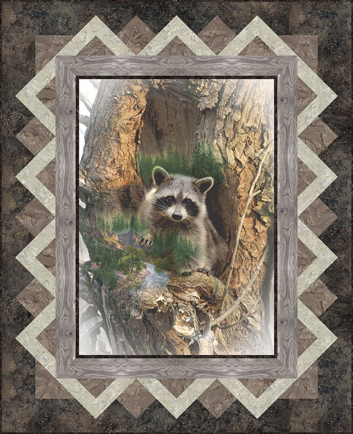 To make this 53″ x 65″ quilt design, you will start with this charming 32″ x 44″ raccoon portrait panel from Hoffman. You will piece the “mountain” border with stone and wood prints, and 2 Hoffman Hand-Dyes. We love the twinkle in the eyes of this furry masked bandit who is peering out at the big wide world.