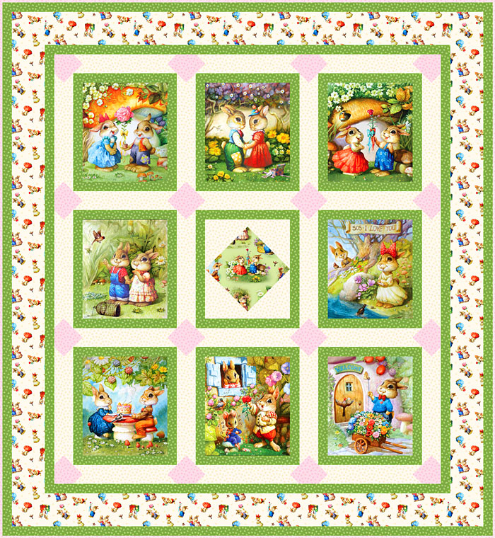 To make this 53″ x 57″ quilt design, you will start by cutting up the 24″ x 44″ block panel. Then you will cut and piece 5 collection coordinates to create this storybook quilt with delightful seasonal colors. Some-bunny special is going to love this charming quilt!