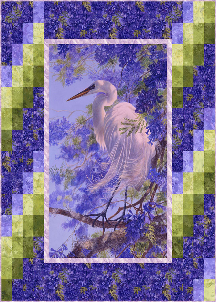 To make this 41″ x 56″ quilt design, you will start with the 24″ x 44″ scenic wildlife panel, then piece 6 Green and Lavender coordinates (including flowers and feathers) to make the mosaic-like border.