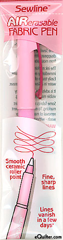 The new Sewline Air Erasable Pen has a 0.8mm ceramic roller ball point, and it glides over fabrics without snagging the surface. The ink is a special formula that does not bleed and keeps a sharp edged, fine line. There is a magic to this ink as it will simply vanish into the air within 2-10 days and will not reappear. If you want to remove or alter something you've drawn, the Sewline marking can be simply dabbed off with plain water. Always test this Sewline pen on a fabric sample before marking up your project. Some fabrics contain sizing or other chemicals which may inhibit ink removal. Sewline AIRerasable Fabric Pen.