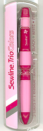 Specially formulated leads give a clear, fine line on most fabrics, easily removed with a damp cloth or washing. Just twist the finger grip for a choice of black, white, or pink leads, and press lightly to draw lines. Leads are refillable too! Always test on a swatch of fabric to be sure lines can be remove, and erase lines before ironing fabric. Sewline Trio Colors erasable fabric pencil, with black, white, and pink ceramic lead.