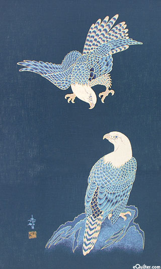 A dramatic pair of eagles - one perched and the other in flight - grace this stunning Noren panel imported from Japan, all in traditional indigo with metallic gold accents. Hand wash in cold water. Line dry. Pre-washing is recommended. 19" x 44" panel, eagles are about 14", with gold metallic.
