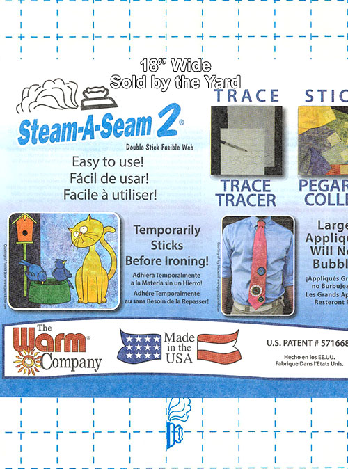Steam-A-Seam fusible web makes no-sew projects uniquely easy. Just trace your design on the gridded backing paper, stick, cut, peel and press! The tacky coating on both sides holds the applique temporarily in place and is repositionable so you can position your work before ironing. Once ironed, the bond is permanent and can be sewn without gumming your needle. Steam-A-Seam can be machine washed and dried and is dry-cleanable for easy care. (The manufacturer does not recommend drying with a dryer sheet. ) Please order in 1 yard increments. By the Warm Company and made in the USA. Steam-A-Seam 2 - Double Stick - Original Weight, 18" wide, sold by the yard.