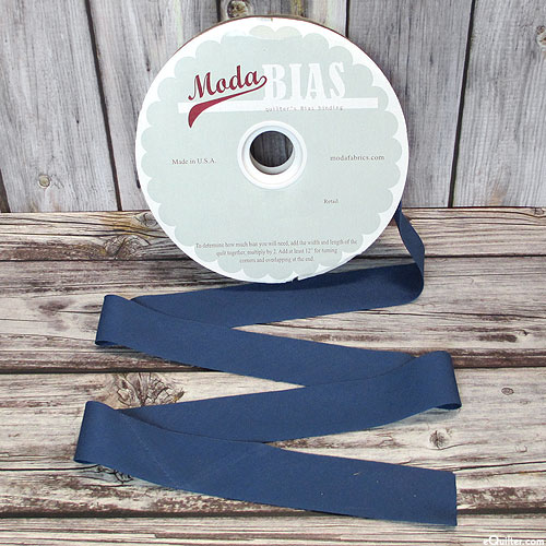 For quilts big or small, finishing is made simple with yards of continuous bias tape in brilliant saturated color. Admiral Blue Solid Quilter's Bias Binding, 2 1/2" wide, pre-folded in half once, sold by the yard. To determine how much bias you will need, add the width and length of the quilt together, multiply by 2, and add at least 12" for turning corners and overlapping at the end.