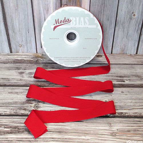 For quilts big or small, finishing is made simple with yards of continuous bias tape in brilliant saturated color. Christmas Red Solid Quilter's Bias Binding, 2 1/2" wide, pre-folded in half once, sold by the yard. To determine how much bias you will need, add the width and length of the quilt together, multiply by 2, and add at least 12" for turning corners and overlapping at the end.