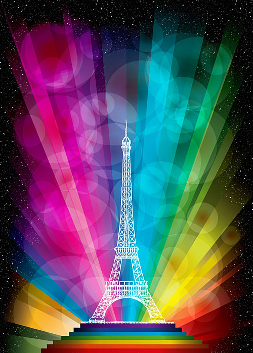 Rainbow rays of color radiate out from a large-scale Eiffel Tower, illuminating the City of Light. Digitally printed, 31" panel, Eiffel Tower is about 24" tall, by the Rubin Design Studio, designed exclusively for eQuilter.