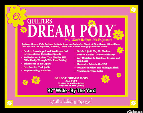 Dream Poly’s exclusive blend of the revolutionary microfibers imparts a very soft hand, exceptional drape, breathability and comfort which surpasses all other polyester quilt battings. You will feel the difference! Dream Poly fibers are blended, carded, crosslapped and needle punched with unique processing that eliminates the need for resins, glue or scrims stabilizers; allowing your needle to glide smoothly through our fine batting. It is versatile for both hand and machine quilting with a soft lovely drape. The perfect batting for most quilting projects, mid-weight quilts, modern quilts and wearables. Finished quilt may be machine washed and dried or dry cleaned. Batting may be stitched up to 8" apart. 'Quilters Dream Black Poly Select Batting', 100% polyester, 93" wide. Sold by the yard.