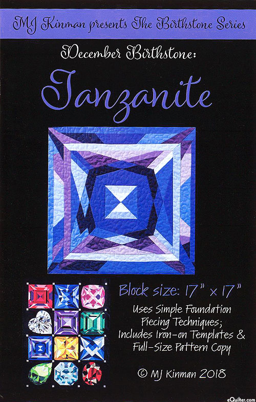 Create your own stunning Birthstone quilt block with a Tanzanite for December, using a single-foundation piecing technique to create the sparkling facets of this gemstone. This pattern includes gemstone template, detailed color chart and assembly instructions. Create this block on its own or create the full series with all 12 gemstones. A great project for a confident beginner. Material requirements include: (4) 18" x 6" fabric pieces in assorted purples or blues; (2) 18" x 9" fabric pieces in blue or purples; (1) 6" x 6" fabric piece in light blue; (1) 12" X 9" blue fabric piece; (1) 9" x 9" fabric piece in medium purple. eQuilter product code FAFQBTAN Fat Quarter pack satisfies the fabric requirements. 'The Birthstone Series: Tanzanite' block pattern by MJ Kinman. Finished size is about 17" x 17".