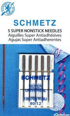 Schmetz Super Nonstick Universal Needles have a non-stick coating of NIT (Nickel-Phosphor-PTFE). Prized by art quilters and others who are sewing with spray adhesives, stabilizers and glues, because these needles resist gumming and thread breakage as you work. Extra-large eye is designed to prevent shredding and breakage when sewing with metallic and other machine embroidery threads and prevention of skipped stitches. Use for machine embroidery, hook and loop tapes and general sewing on most materials. Super Nonstick Universal Sewing Machine Needles, sold in sets of 5, size 80/12, from Schmetz.