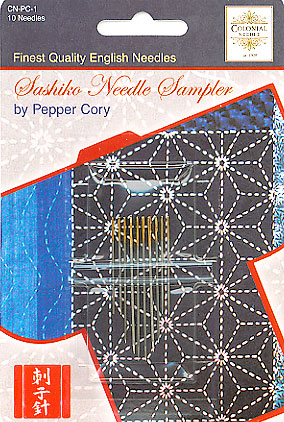 Inspired by the classic Japanese needle art of Sashiko, quilt designer, teacher, and author Pepper Cory has chosen the perfect needles for this ancient, elegant form of stitchery. Experiment with sashiko stitching using this sashiko needle sampler that features four sizes of superior quality English needles. Try with eQuilter's sashiko threads, too! Sashiko Needle Sampler by Pepper Cory, package includes 10 needles from Colonial Needle.