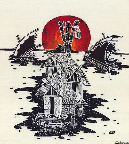 Handmade using batik and painting methods, this striking panel may be used in wall hangings, pillows, appliqués, quilts, clothing embellishments, framed pictures, and much more! It features a breathtaking view of three humble pavilions rising above placid waters amid slowly sailing boats, all before a red setting sun. Hand-painted batik panel, panel is about 18" x 18", Machine Wash Gentle/Line Dry Colorfast. Each panel is a unique work of art and will vary slightly from original shown.