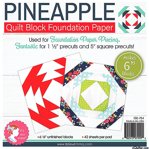 Make perfect paper pieced Pineapple blocks with this set of foundation papers complete with instructions. Fantastic for 1 1/2" strips and 5" charms, this size makes 6 1/2" unfinished blocks that will finish at 6". 'Pineapple Quilt Block Foundation Paper', 42 sheets, makes 6" blocks, by It's Sew Emma.
