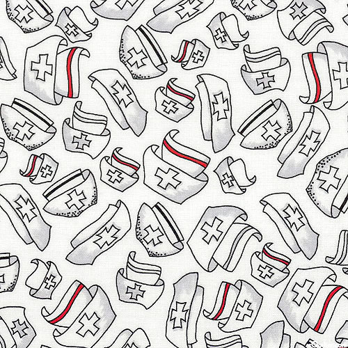 A profusion of nurses hats tumbles over a solid ground in this nifty companion print to the rest of this whimsical collection. Perfect for your creative projects saluting our hard working, and stylish, medical professionals! Larger hats are about 1", 'Happy Hats' from the 'Nifty Nurses' collection by Loralie Harris for Loralie Designs.