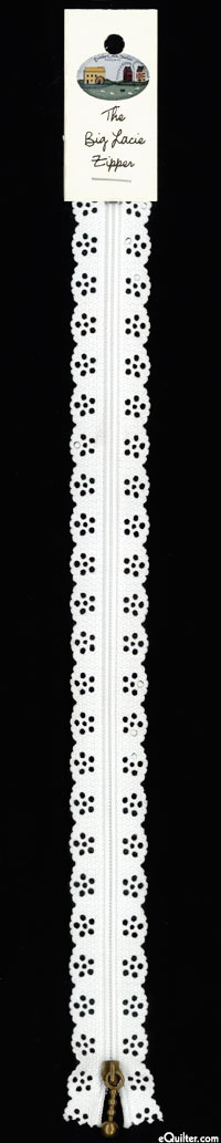 This zipper makes a fashion statement with scalloped edges and punch-out flowers. No need to hide it, sew it right on the outside of your next skirt, jacket, or purse. Zipper has an attractive designer pull, too. The Big Lacie Zipper, 12" white, by Border Creek Station.