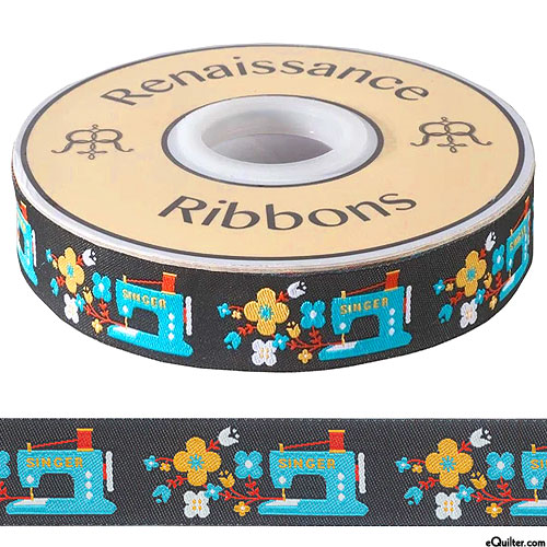 The uses for this high-quality, woven jacquard ribbon are just as creative as you are. Embellish quilts, crafts and apparel, make accessories or home decor projects, add to bags and purses, dog collars and leashes, and so much more! 100% polyester jacquard ribbon, 7/8" wide, 'Blue Sewing Machine' by Jessica Jones for Renaissance Ribbons. Sold by the yard.