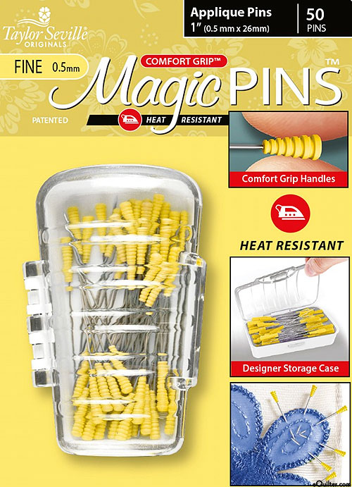 These magic pins have a comfort grip handle, are heat resistant and come in their own designer case. Shorter and thinner than the regular Magic Pins, applique pins are a convenient way to tack down smaller pieces. 'Magic Pins' by Taylor Seville. Includes 50, Fine (0.5mm x 26mm) 1" applique pins with comfort grip handles.