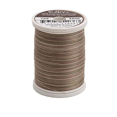 These popular variegated threads from Sulky are a masterful blend of different colors within the same range of tone and intensity, with random, subtle color changes every 2-1/2 to 5 inches. Blendables add depth and dimension to freemotion embroidery, fashion sewing and home dec projects. Made of the highest quality, long-staple, 100% Egyptian Cotton on snap-end King Spools. Ideal for quilting, thread lace, bobbin work, thread painting, red work and decorative embroidery. Recommended Needle: 90/14 Topstitch. Sulky Blendables, 500 yard 30wt. king size snap-spools, color #4036.
