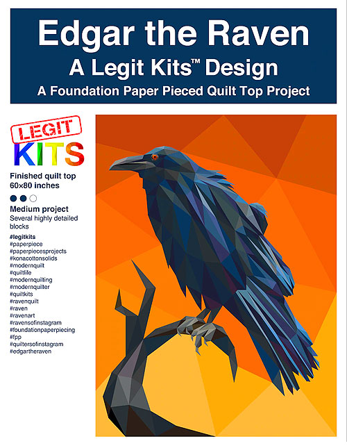 Go on a quilting adventure to construct Edgar the Raven using foundation paper piecing. This is one of Legit Kits medium difficulty projects with several highly detailed blocks, creating a challenging yet very addictive, project. The pattern walks you through the process with a complete user's guide including color map, color gradient list, color code list, assembly guide, cutting guide, and foundation paper pieces. Use up your solid stash as this richly colored Raven requires scraps from fragments to a 1/2 yard of bright warm tones, deep cool tones, and stunning neutrals for a total of 45 different colors, perfect for pre-cuts too. 'Edgar The Raven' paper piecing quilt pattern by Legit Kits. Finished size is about 60" x 80".