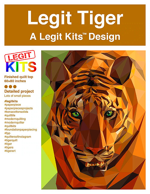 Go on a quilting adventure to construct this Legit Tiger using foundation paper piecing. This is one of Legit Kits more difficult projects with lots of smaller pieces, creating a challenging yet very addictive, project. The pattern walks you through the process with a complete user's guide including color map, color gradient list, color code list, assembly guide, cutting guide, and foundation paper pieces. Use up your solid stash as this richly colored Tiger requires scraps in a rainbow of 60 different colors, perfect for pre-cuts too. 'Legit Tiger' paper piecing quilt pattern by Legit Kits. Finished size is about 60" x 80".