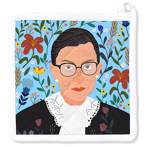 This Supreme Court Justice can handle the heat! Support women's rights by showing your support for a long-standing late Supreme Court Justice. 'Ruth Bader Ginsburg RBG' Potholder. 8" x 8", 100% cotton with cotton fiber insulation. Digitally printed in the USA. Machine washable, cold water on gentle cycle.